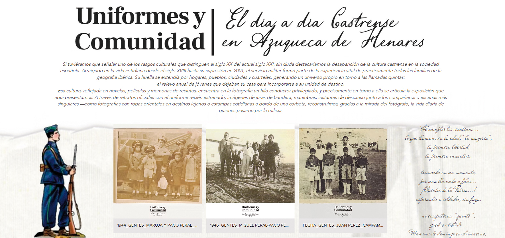 La asociación ‘Azuqueca en la Senda del Tiempo’ ha incorporado una nueva exposición a su archivo digital, se trata de ‘Uniforme y Comunidad’, que cuenta con 50 nuevas imágenes que recogen el el día a día castrense en Azuqueca de Henares”. Las fotografías pertenecen a la colección de Máximo Serrano Romo, vecino fallecido en 2021, y están disponibles pinchando AQUÍ.